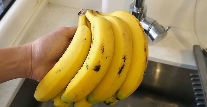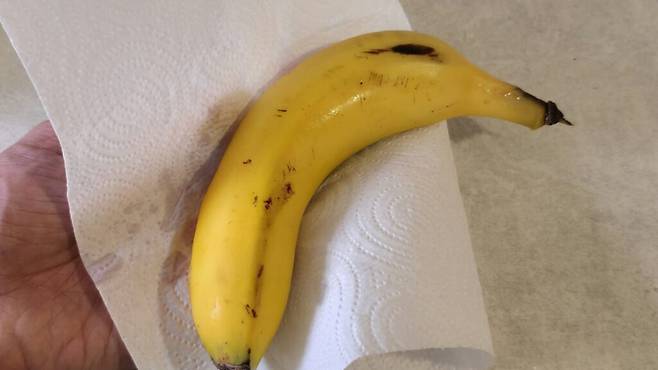 이렇게 씻은 바나나는 반드시 물기를 잘 제거하세요. 물기가 남아 있으면 망가지기 쉽습니다.