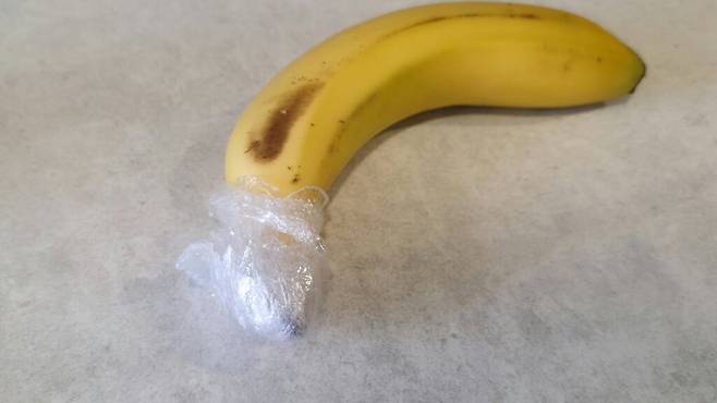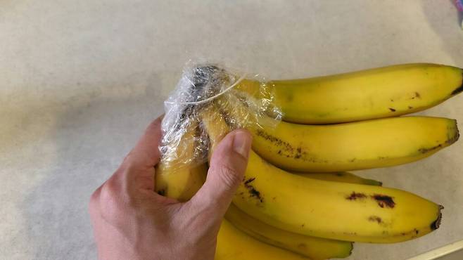 랩 적당량을 준비해 꼭지 부분을 감싸주는 것만으로도 후숙 속도를 2~3일 정도는 늦출 수 있어 더 오랫동안 신선한 바나나를 먹을 수 있습니다.