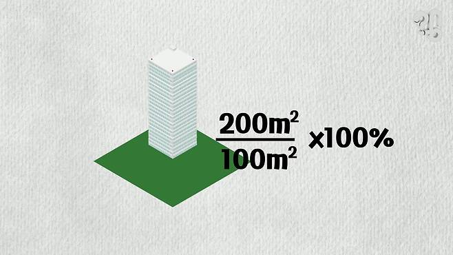 용적률은 쉽게 말해 그 땅에 얼마나 부피가 큰 건물을 짓느냐를 나타낸다. 지역마다 다르지만 아파트나 주택을 짓는 주거지역 용적률은 보통 200~250%.