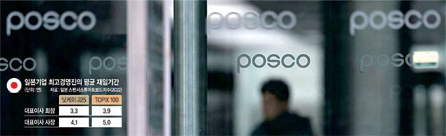 제2차 세계대전 후 재벌 해체를 겪은 일본의 기업들은 대부분 소유가 분산돼 있다. 일본 ‘스펜서스튜어트보드’ 지수(2022년)에 따르면 도쇼주가지수(東證株價指數·TOPIX) 100 기업의 대표이사 회장의 평균 임기는 3.9년, 대표이사 사장 또는 CEO의 평균 임기는 5년으로 조사됐다. 미국도 S&P500의 평균 CEO 재임 기간은 7.2년, CEO 재임 기간의 중앙값은 4.8년이다. 일본철강기업의 CEO 역시 길어야 5년 재직하는 것이 불문율처럼 돼 있다.