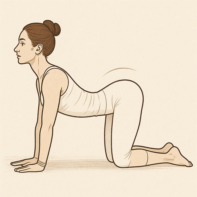방법: 바닥에 무릎을 꿇고 엎드린 자세에서 시작합니다. 숨을 들이쉬면서 배를 바닥으로 내리고 가슴을 활짝 열어 시선을 천장으로 향하게 합니다. (소 자세) 그 다음, 숨을 내쉬면서 배를 등쪽으로 당기고 척추를 둥글게 말아 시선을 배꼽으로 향하게 합니다. (고양이 자세)