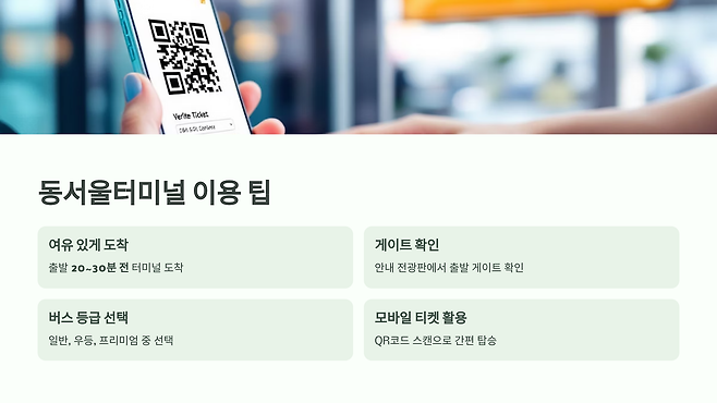 동서울터미널을 처음 방문하거나 오랜만에 이용하는 분들을 위해 몇 가지 유용한 팁을 알려드립니다.
