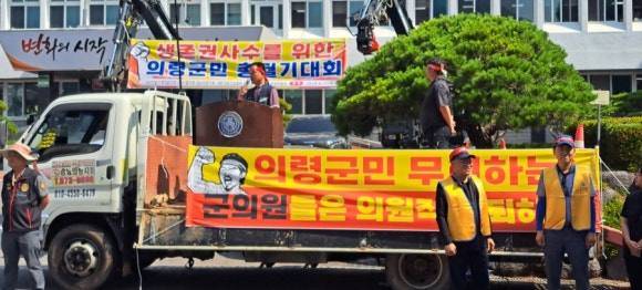 11일 의령군청 앞 광장에서 생존권 사수를 위한 의령군민 총궐기대회를 열고 군의회가 추경안을 심의도 하지 않고 뭉개고 있어 분개하지 않을수 없다고 항의했다.