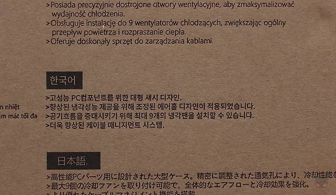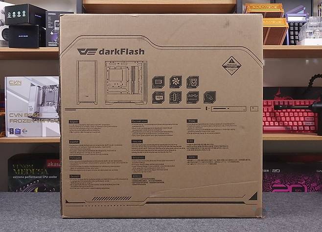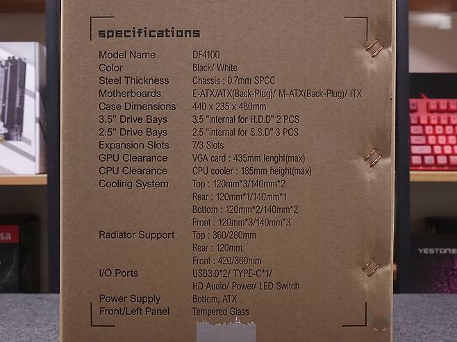 제품박스부터 살펴보면, 전면에는 DF4100 모델명과 함께 제품 풀샷 이미지를 담고 있습니다. 그리고, 반대쪽 후면에는 주요 특징과 특징부분은 한국어를 포함한 다국적 언어로 표기해 놨죠. 주요 특징에는 최대 420mm 라디에이터 장착 지원, 최대 9개의 쿨링팬 장착 지원, 최대 185mm 높이 공랭쿨러 장착 지원, 최대 435mm 길이 그래픽카드 장착 지원, 먼지 필터와 USB 포트 지원을 언급하고 있습니다. 물론, 박스 한쪽 측면에 제품의 기본 사양표기를 해놨기 때문에 좀 더 자세하게 확인할 수 있고, 오프라인 매장에 구입 시에도 충분히 도움이 되는 정보입니다.
