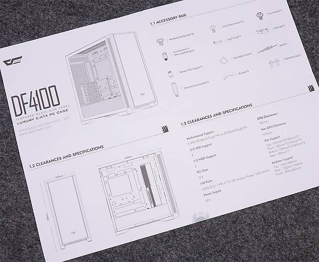 제품 포장은 케이스 기본 비닐포장과 함께 외부 충격보호를 위한 스티로폼 포장재를 사용했으며, DF4100 PC케이스를 제외한 나머지 구성품에는 제품 설명서, 부품장착에 사용되는 나사들, stand-off 렌치, 여분의 볼헤드핀 클램프, USB 포트 마개, 비프음 스피커, 소량의 케이블타이를 제공해주고 있습니다. 기본 케이스 구조형태이기때문에 제품 설명서 내용은 비교적 간단합니다.
