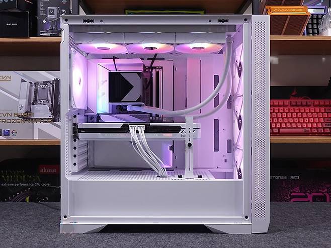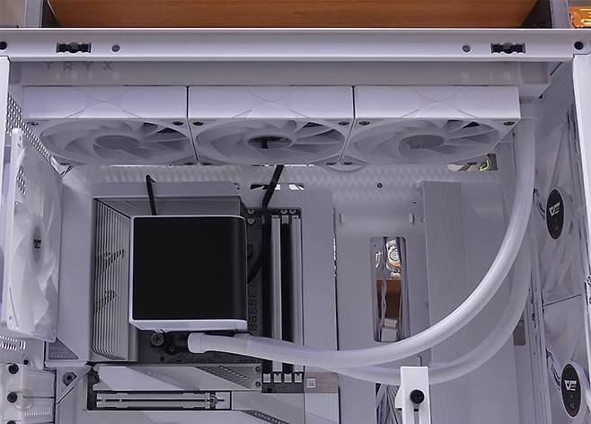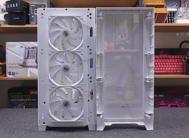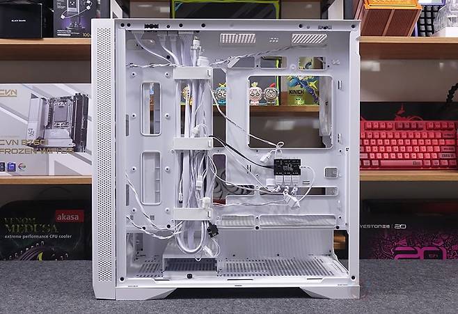 파워서플라이와 저장장치까지 장착을 마치면, 마무리로 케이블정리를 해주면 되는데, 조금 아쉬운 점이라면 역시 ARG 허브가 트레이부분에 위치하고 있기 때문에 케이블 정리가 깔끔하게 보이기에는 약간 난해한 부분이 있습니다. 그래도, 케이블 클립이 적용되어 있어서 정리하는 데는 큰 어려움이 없으며, 선정리 커버 패널이 있어서 확실히 조립 후 내부는 깔끔한 모습을 구현할 수 있죠. 조립 후 전원을 켜면 전면과 후면 기본 장착된 140mm 팬에서 RGB 라이트닝 효과를 바로 확인할 수 있으며, 앞서 언급했듯이 사용하는 메인보드가 RGB Sync를 지원하면 ARGB 연결해서 연동으로 사용할 수 있고, 만약 RGB Sync가 없다면 기본 전원만 연결해서도 상단 LED 버튼을 통해 다양한 모드전환 효과를 볼 수 있습니다. 끝으로, 케이스 쿨링구조를 인공 연기 포그머신을 통해 확인해 보면, 전면 3개의 쿨링팬을 통해 유입되면서 내부 상단과 후면으로 빠지는 구조를 쉽게 확인할 수 있습니다.