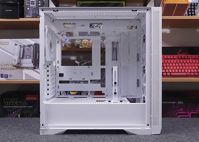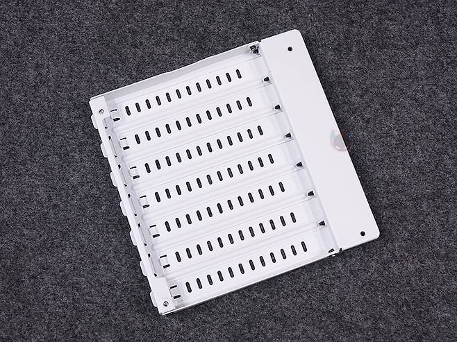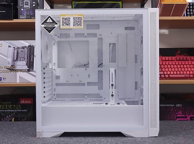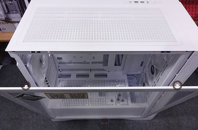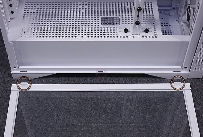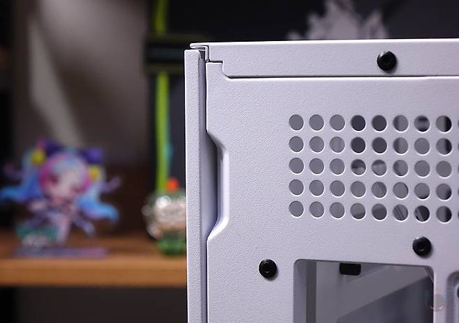 사이드 패널 같은경우에는 전면 기준 왼쪽 패널은 강화유리 패널로 후면 손잡이 홈을 통해 바로 분리할 수 있는 무나사 방식의 스냅핏 흔히 말하는 볼헤드핀 클램프 방식을 적용했습니다. 물론, 패널 아랫부분에는 걸쇠처리를 해놨으며, 유리 안쪽 테두리 위아래는 프레임을, 양쪽으로는 닫을 때 충격보호를 위해 패드를 부착해 놨죠. 참고로, 개봉 시 강화유리 보호비닐이 부착되어 있는데, 기포 없이 이 깔끔하게 부착되어 있기 때문에 바로 제거할지 사용하다가 제거할지 사용자가 판단하면 됩니다. 그리고, 반대편 오른쪽 패널은 새시 패널이면서 역시 무나사 방식의 볼헤드핀 클램프 방식을 적용하고 있죠. 그래서, 전면과 양쪽 패널 모두 별도의 공구 없이 바로 분리할 수 있는 편리함이 있습니다.
