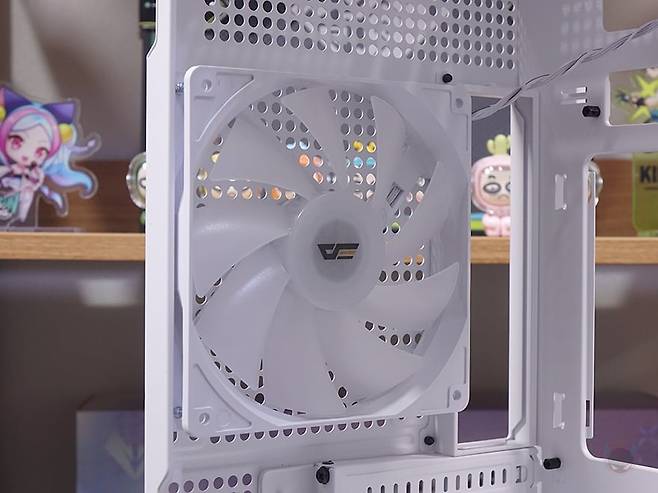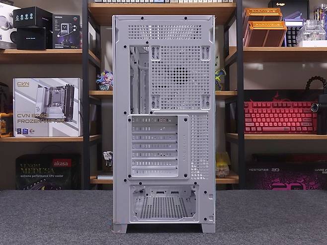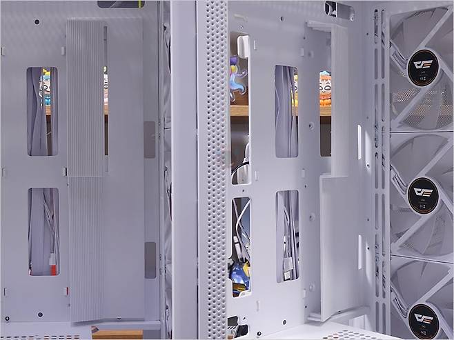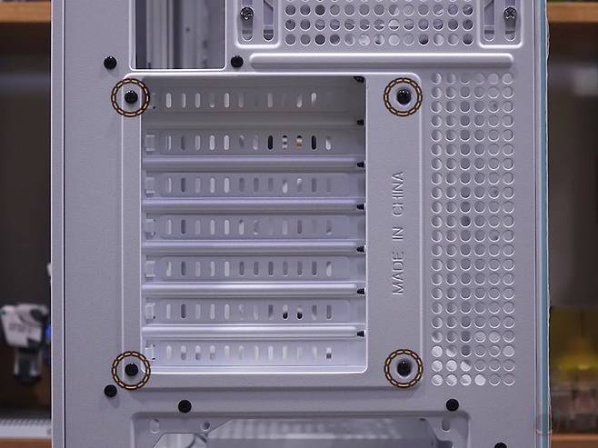 케이스 후면에는 후면 배기 역할로 에어홀 처리와 함께 내부에 140mm 팬이 기본 장착된 것을 미리 간접적으로 확인할 수 있는데, 나사홀이 120mm도 있어서 120mm 교체 장착도 가능합니다. 또한, 바로 위 그러니깐 내부 상단부분의 후면에도 에어홀 처리를 해놨는데, 높이가 꽤 있어서 상단 공간 확보를 충분히 하고 있다는 것도 짐작할 수 있죠. PCI슬롯은 미들타워 기준인 7개를 갖추고 있으며, 슬랫 주변에 고정 나사를 풀면, 분리해서 90도 방향전환을 할 수 있습니다. 즉, 그래픽카드를 수직방향으로 장착할 수 있게 해 주죠. 물론, 별도의 라이저케이블(https://darkflash.co.kr/product/detail2.html?product_no=698)을 구매해서 사용해야합니다. 그리고, 맨 아래에는 파워서플라이 자리로 상하방향 모두 장착할 수 있게 나사홀이 처리되어 있죠.