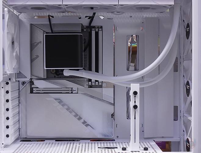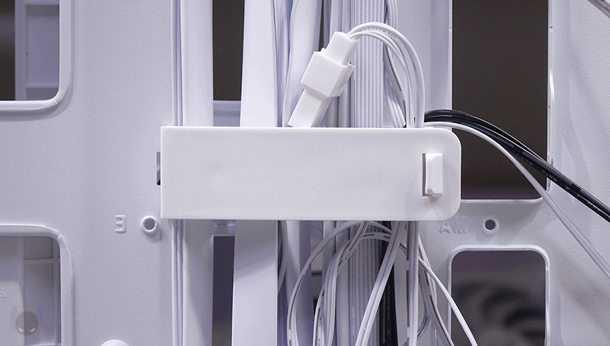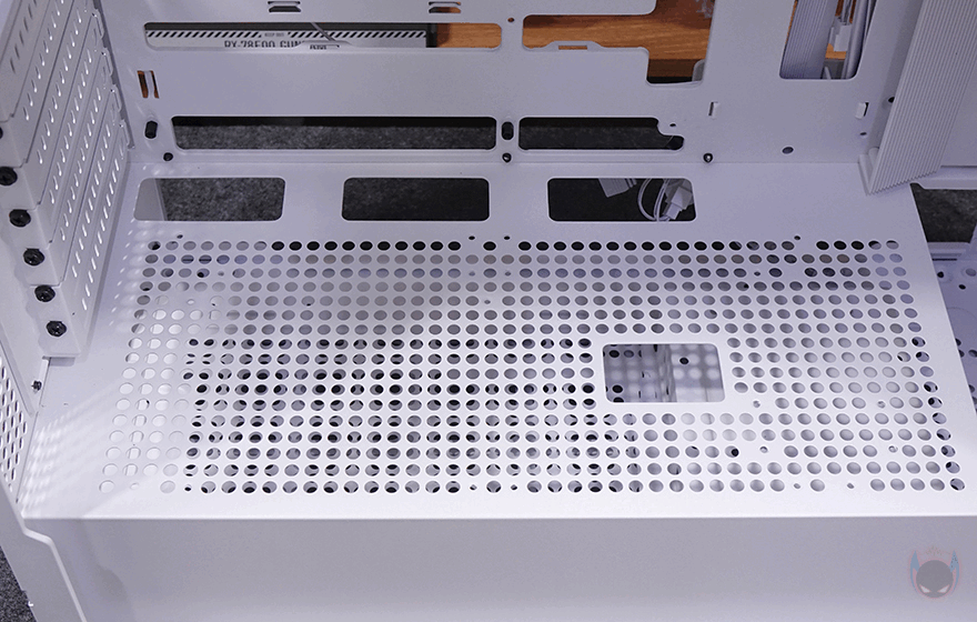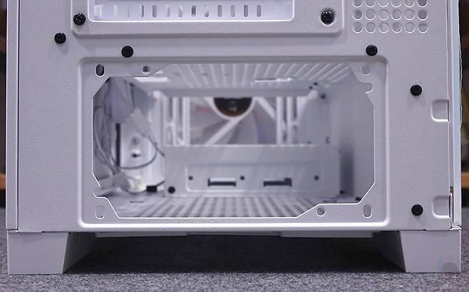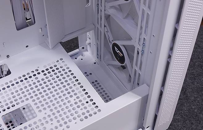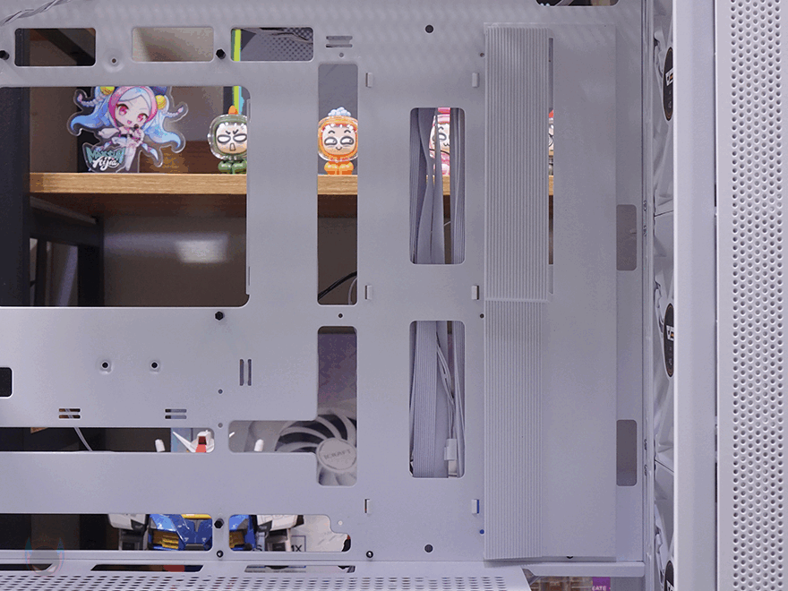또한, 내부 하단과 공간 분리를 해주는 파워서플라이(PSU) 커버도 적용되어 있는데, 커버 상단에는 그래픽카드(VGA) 지지대도 기본 장착되어 제공해주고 있습니다. 모두 손나사 방식으로 지지대 위치조절은 물론, 지지대 받침대 위치조절까지 가능하죠. 또한, 커버부분에도 전체적으로 에어홀 처리와 선정리 홀이 주요 위치마다 배치되어 있으며, 그래픽카드 지지대를 사용하지 않는다면, 분리해서 커버 상단에 추가로 140mm 또는 120mm 팬을 최대 2개 장착해 추가 쿨링시스템을 갖출 수도 있습니다. 그리고, 내부 후면에는 앞서 외부에서 언급했던 배기 역할의 140mm 팬을 다시 확인할 수 있는데, 전면과 동일한 모델(C7A)이며, 기본 제공되는 팬 모두 ARGB 팬에 3 Pin 연결방식으로 팬속도는 950(±10%) RPM입니다. 그리고, 아래 PCI 슬롯 가이드는 모두 재사용이 가능한 착탈식이죠.