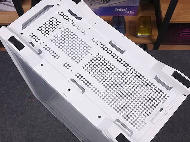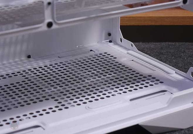 케이스 밑바닥부분에는 받침대를 제외한 전체 영역으로 분리형 먼지 필터가 장착되어 있는데, 전면에서 분리할 수 있어서 청소 시 편하며, 필터를 분리하면 하단 쿨링효과를 위해 전체적으로 에어홀 처리를 해놨습니다. 또한, 내부에서 확인하겠지만, 내부 하단 앞자리에 HDD베이를 분리할 수 있게 걸쇠방식으로 적용된 것도 확인할 수 있죠. 받침대는 약 22mm 높이를 가졌으며, 패드도 기본 부착되어 있습니다.