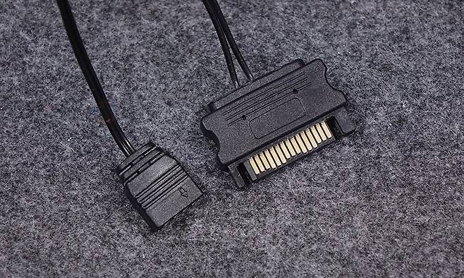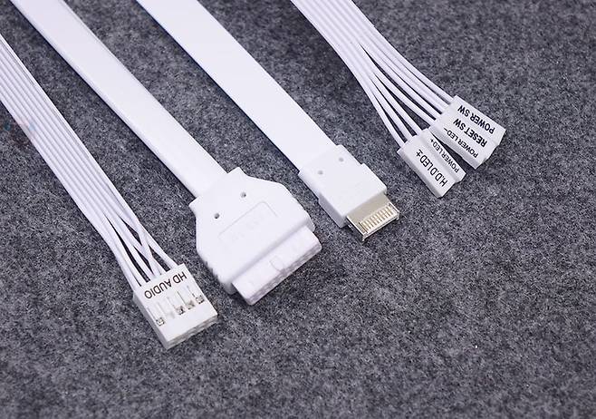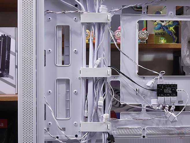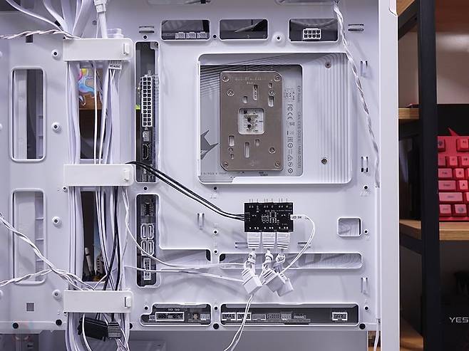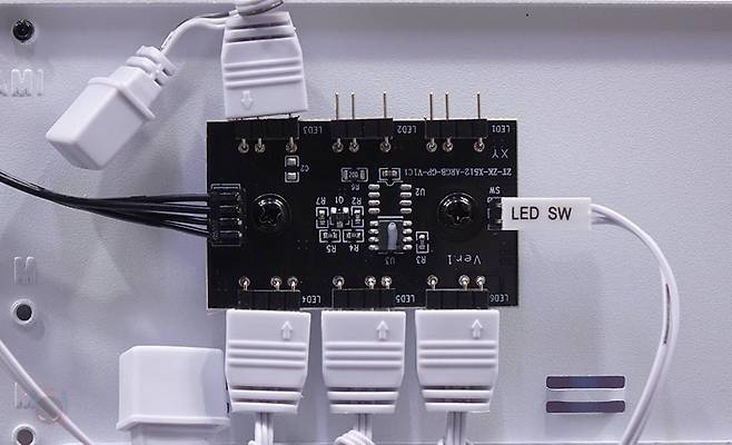 메인보드 트레이 후면을 살펴보면, CPU 컷-아웃 홀 바로 아래에는 ARGB 허브가 장착되어 기본 제공되는데, ARGB 헤더만 장착할수 있고, 최대 6개까지 연결이 가능합니다. 물론, 메인보드와 연결할 수 있는 5V ARGB 케이블도 있으며, 사용하는 메인보드에 5V ARGB 헤더가 없는 경우 바로 파워서플라이와 연결해 사용할 수 있게 SATA 전원케이블도 갖추고 있죠. 조금 아쉬운 점이라면 팬까지 연결할 수 있는 허브였으면 더 낫지 않았을까 생각됩니다. 그리고, 왼쪽에는 선정리홀 위치에 맞춰서 케이블을 묶어둘 수 있는 클램프형 클립이 적용되어 있으며, 바로 옆 그러니깐 선정리 커버 패널과 같은 위치에 후면에는 2.5인치 HDD/SSD를 최대 2개까지 장착할 수 있게 나사홀을 처리해 놨습니다. 또한, 내부 하단 앞자리에는 외부에서 언급했던 HDD 베이가 장착되어 있는데, 손나사를 풀면 분리가 가능하고, HDD 베이에는 안쪽에 기본 3.5인치 HDD 1개와 상단에 3.5인치 HDD 또는 2.5인치 HDD/SSD를 추가로 1개 더 장착할 수 있게 지원하고 있습니다. 그리고, 하단 후면 파워서플라이 자리에는 진동소음 최소화를 위해 패드를 기본 부착해 놨으며, 케이스에 버튼 및 포트 케이블들도 색상에 맞춰서 화이트 케이블을 사용했습니다. 끝으로, DF4100 PC케이스에 사용된 새시의 두께를 측정할 수 있는 위치별로 측정해 본 결과 0.6~0.8mm 대인 것을 확인할 수 있습니다.