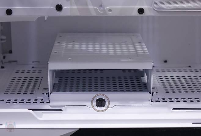 이제 다크플래쉬 DF4100 PC케이스의 내부를 살펴보는데, 내부에서 가장 눈에 띄는 부분 중 하나는 바로 메인보드가 장착되는 트레이 부분으로 CPU 컷-아웃 홀과 주변 선정리홀 외에 백-커넥터 메인보드 흔히 말하는 BTF 메인보드를 장착할 수 있게 홀처리를 해놨습니다. ATX와 M-ATX BTF 메인보드 모두 장착 가능하죠. 그리고, 트레이 맨 앞쪽에는 케이블 정리 시 깔끔하게 보이도록 선정리 커버 패널을 적용했습니다. 물론, 후면 고정나사를 풀면 커버 패널 분리가 되고, 앞뒤로 위치조정도 가능하죠.