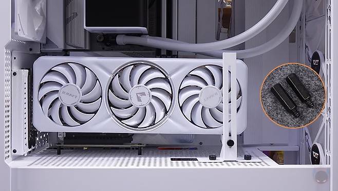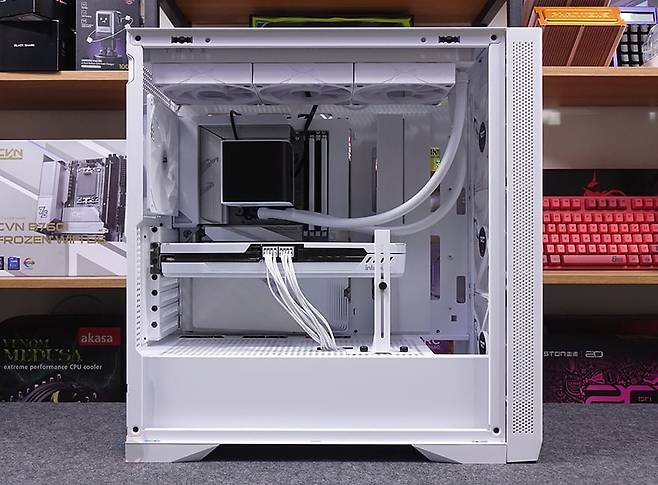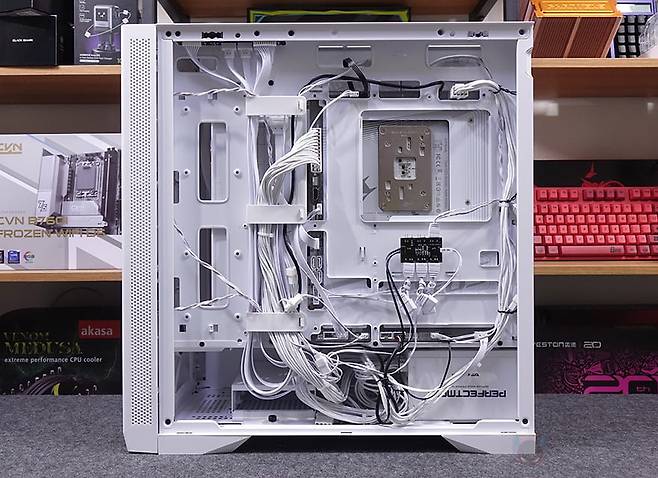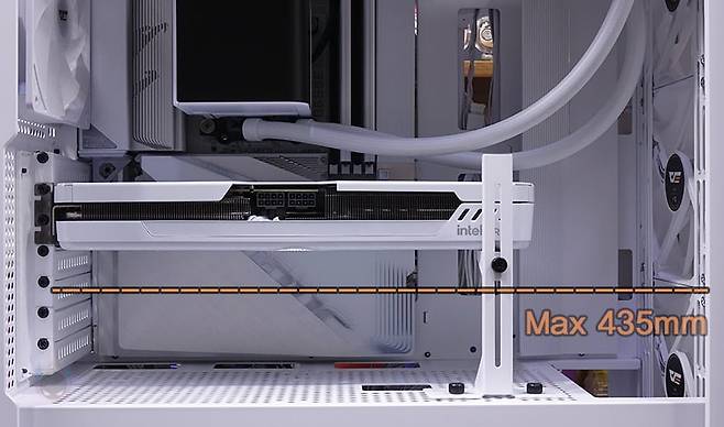 직접, 다크플래쉬 DF4100 PC케이스를 사용해 시스템 조립을 해보면, 앞서 언급했듯이 메인보드는 폼 규격으로는 E-ATX까지 장착이 가능하며, 파워서플라이 케이블과 연결되는 커넥터가 앞에 배치되는 기본형부터 백-커넥터 일명 BTF 메인보드까지 장착이 가능합니다. 실제 BTF 메인보드를 장착해 보면, 확실히 기본형 메인보드보다 내부가 깔끔한 효과를 볼 수 있고, 후면 커넥터도 케이스 홀처리에 완벽하게 배치되죠. CPU쿨러 같은 경우 공랭쿨러 타워형을 장착할 때는 최대 185mm까지 가능하기 때문에 사실상 시중에 판매되는 타워형 쿨러는 모두 장착이 가능하다고 보면 되고, 수랭쿨러시에는 전면에 기본 팬이 장착되어 있기 때문에, 기본 장착은 상단이며, 최대 360mm 라디에이터를 장착할 수 있습니다. 그래픽카드(VGA)는 최대 435mm 길이까지 가능하기 때문에 역시 시중에 판매되는 제품들은 대부분 장착이 가능하다고 보면 되고, 앞서 확인했듯이 PCI 슬롯 방향전환이 가능하기 때문에, 라이저케이블만 있으면 수직방향으로도 장착이 가능합니다. 물론, 라이저케이블 받침대 stand-off는 기본 제공해주고 있죠.