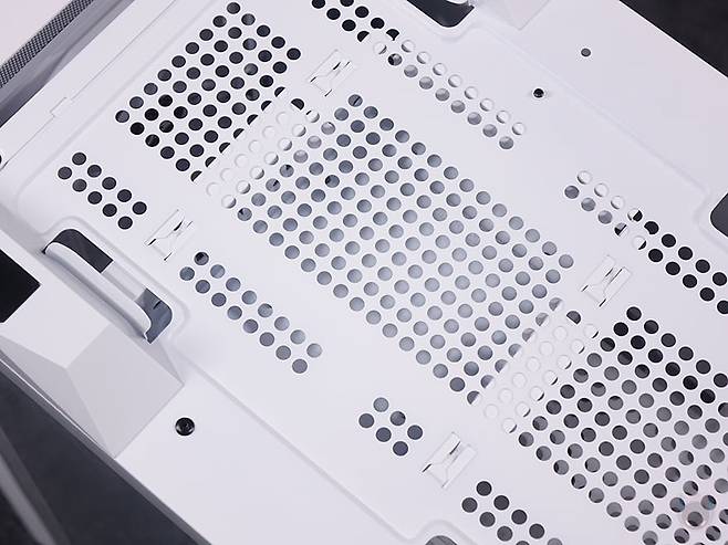 케이스 상단에는 자석방식의 먼지필터가 장착되어 있으며, 필터를 분리하면 내부 상단에 쿨링시스템을 추가로 갖출 수 있게 에어홀 처리와 함께 양쪽으로 나사홀 처리가 되어 있습니다. 팬 장착시에는 140mm 최대 2개 또는 120mm 최대 3개를 장착할 수 있으며, 수랭쿨러시 라디에이터는 최대 360mm까지 장착할 수 있습니다. 그리고, 상단 맨 오른쪽 앞부분에는 버튼 및 포트가 나열되어 있는데, 맨 앞에 전원버튼을 시작으로 뒤로 리셋 버튼, 오디오/마이크 포트, USB 3.0 타입 A포트 2개, USB 타입 C포트 1개, LED 모드 버튼순으로 배치되어 있습니다.