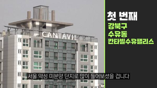 첫 번째. 서울 강북구 수유동 칸타빌 수유팰리스다. 서울 악성 미분양 단지로 많이 알려진 단지다. 2022년 3월 분양한 단지로 최초 분양시 총 216가구 중 198가구가 미계약됐다. 비싼 분양가의 영향이 컸다. 전용 59㎡ 분양가는 8억원에서~9억원 대. 인근 시세보다 30% 이상 비싼 금액이다. LH가 악성 미분양으로 남은 이 단지 소형 주택을 매입해서 논란이 되기도 했는데, 수요자가 매입하지 않은 단지를 비싸게 사준다고 해서 질타를 받았다.