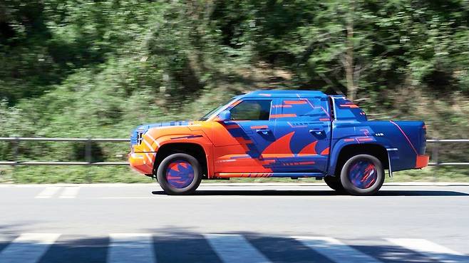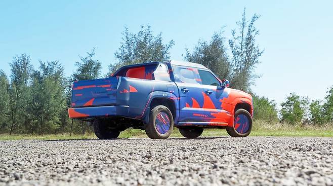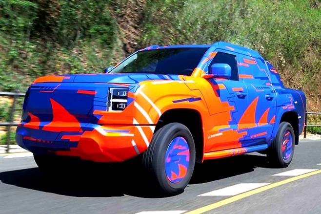 파란색과 주황색의 독특한 카모플라주 패턴을 입은 BYD 픽업 트럭은 자세한 세부 사항을 알아내기 어려운 상태다. 다만 북미 시장에서 일반적인 풀사이즈 트럭과는 다르다는 점을 짐작할 수 있다.