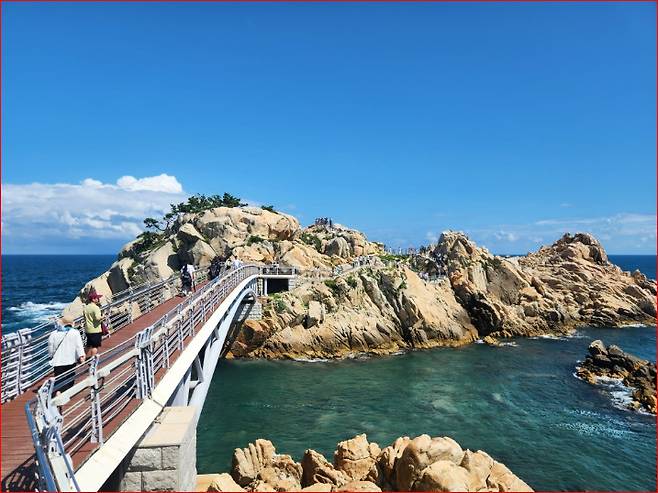 대왕암공원의 이름이기도 한 대왕암은 신라 문무대왕의 왕비가 세상을 떠난 뒤, 호국룡이 되어 남편을 따라 바닷속으로 잠겼다는 전설이 깃든 곳입니다. 신비로운 이야기가 전해지는 이 바위는, 실제로 동해 끝자락 가장 뾰족한 해안에 우뚝 솟아 있으며, 기암괴석들이 바다 위로 흩어져 있는 장면은 선사시대 공룡이 웅크린 듯한 인상을 줍니다.