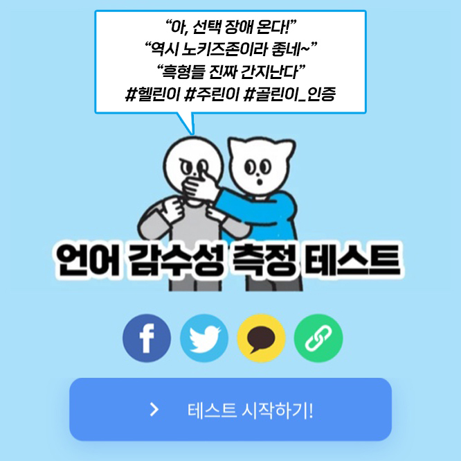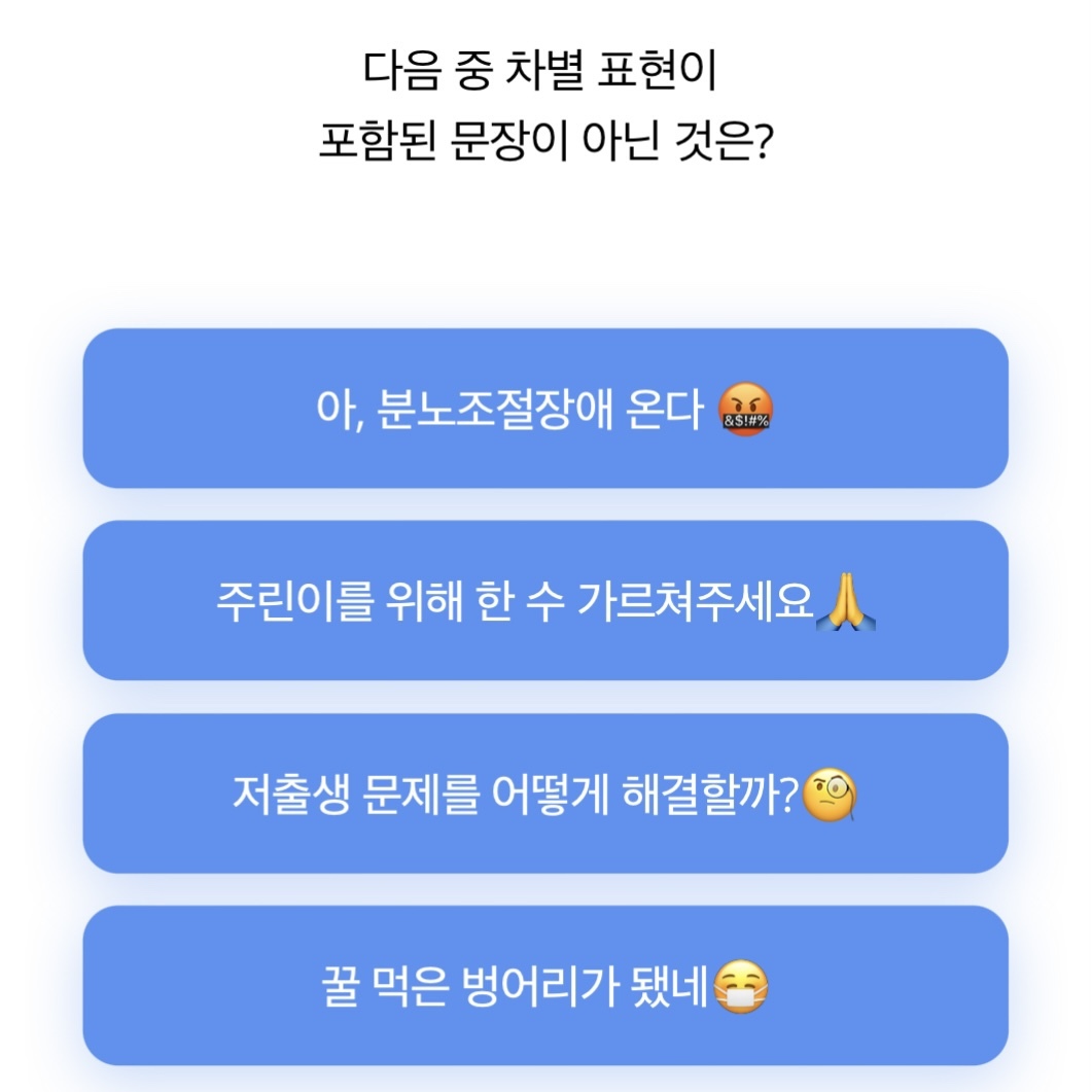 그 자리에서 직접 말하기 곤란하다면 이런 테스트를 권해 보면 어떨까요? 저는 최대한 많은 사람이 차별 언어와 관련된 담론에 참여했으면 좋겠어요. 그리고 이러한 것들이 담론의 장을 열어주는 역할을 할 거라 생각해요.