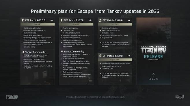 배틀스테이트 게임즈는 오늘(19일), 공식 SNS를 통해 2025년 로드맵을 공개했다. 오는 5월부터 8월까지 패치 내역을 정리한 이번 로드맵은 맵 최적화, AI 행동 개선, 오디오 시스템 향상, 플래시라이트 효과 수정 등 여러 개선 사항이 포함되어 있으며, 여름 시즌부터 순차적으로 대규모 이벤트를 예고했다. 특히 8월에 진행될 ‘0.16.9.0’ 패치 이후에는 게임의 완성도를 높이는 대규모 콘텐츠가 포함될 예정이며, '이스케이프 프롬 타르코프'의 연내 정식 출시도 언급했다. 그리고 오는 6월 신규 로드맵 발표를 통해 추가 소식을 공개할 것이라고 덧붙였다.