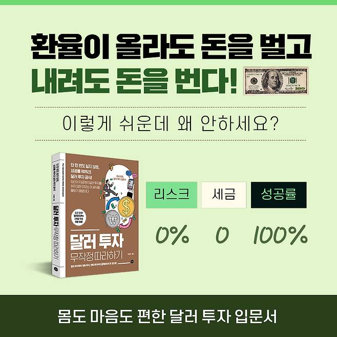 환율 상승기에는 달러 투자로 수익을 얻고, 환율 하락기에는 원화 투자가 수익을 얻기 수월합니다. 그리고 이 두 가지 투자를 동시에 하게 되면 더욱더 잃지 않는 안전한 투자가 가능해집니다.