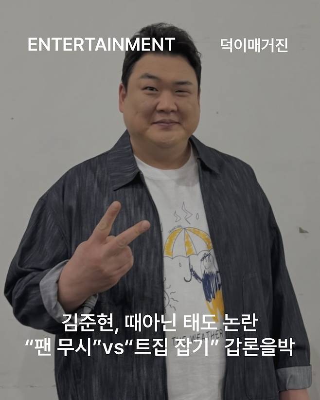개그맨 김준현이 태도 논란에 휩싸였습니다. 최근 온라인 커뮤니티 상에는 김준현의 출근길 영상이 확산됐습니다. 해당 영상은 지난 10일 김준현이 KBS2 '더 시즌즈 - 10cm의 쓰담쓰담' 녹화를 위해 방송국에 출근하는 모습이 담겼습니다. 영상에서 김준현은 궂은 날씨에 매니저가 씌워주는 우산 아래에서 휴대폰을 확인하며 KBS 건물 안으로 들어갔습니다. 이때 입구에 서서 영상을 찍던 팬들은 "안녕하세요", "김준현 파이팅" 등의 응원과 인사를 건넸습니다. 하지만 김준현은 무표정으로 앞을 스쳐지나갔습니다. 반면 건물 안에서 방송 관계자와 마주치자 밝게 미소지으며 정중히 허리를 숙여 인사했고, 반갑게 악수를 나누기도 했습니다.