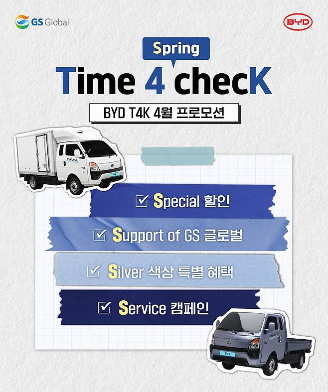 GS글로벌이 BYD 1톤 전기트럭 T4K 구매 고객을 위한 4월 특별 프로모션을 진행한다고 31일 밝혔다. 이번 프로모션은 친환경 상용차 도입을 촉진하고, 보다 많은 고객들이 전기트럭의 경제성과 실용성을 경험할 기회를 제공하기 위해 마련됐다.