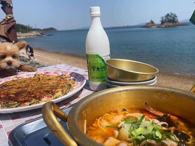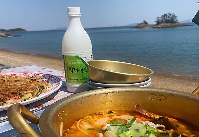 군산 앞바다를 바라볼 수 있는 '무녀도갈매기'는 포장마차 감성을 느낄 수 있다. 라면부터 해물파전, 아메리카노, 빙수까지. 다채롭게 메뉴 구성이 되어 있어 종잡을 수 없는 곳이지만 뷰 하나만은 기가 막힌다. 바다 바로 앞에 파라솔을 펼쳐놓고 오션 뷰를 바라보며 먹는 라면은 유명 레스토랑의 고급스러운 파스타를 가져와도 비교 불가다.