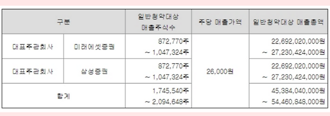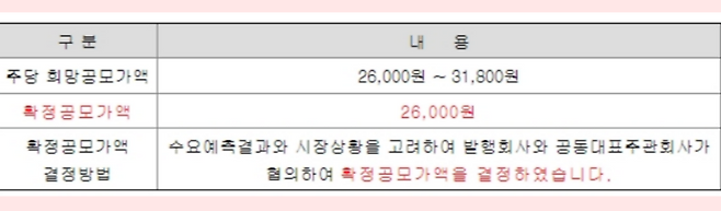 수요예측 결과, 공모가는 희망 범위(2만6000원~3만1800원) 중 최하단인 2만6000원으로 확정됐어요. 예상 시가총액은 1조8154억원이라고 하네요.
