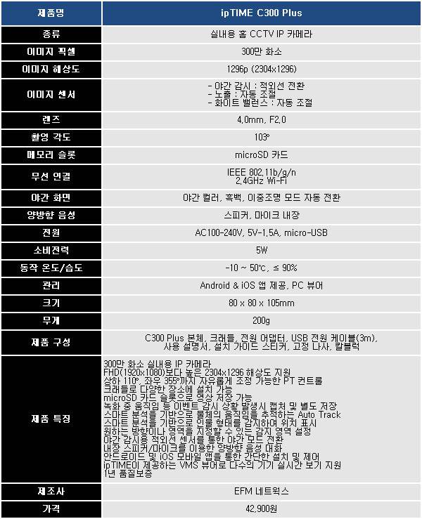 EFM네트웍스에서 300만 화소의 홈 CCTV IP 카메라인 ipTIME C300 Plus를 출시했다.