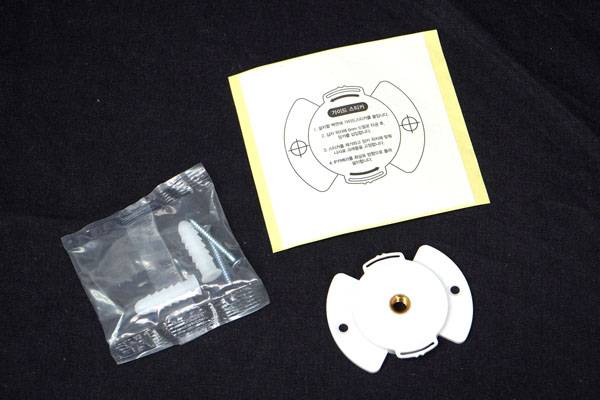 ipTIME C300 Plus 제품 구성으로는 카메라 본체와 사용 설명서, USB 전원 어댑터 및 전원 케이블, 전용 크래들, 크래들 설치용 칼블럭과 고정나사, 크래들 설치 가이드 스티커가 포함된다.