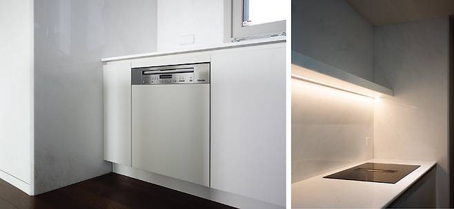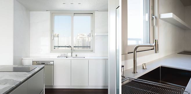 아일랜드 측면 4m에 이르는 넓은 공간에는 싱크볼과 인덕션을 매립하여 효율적인 조리대 공간을 완성했다. 창문을 가리지 않도록 상부장은 생략하고 하부장만 설계해 깔끔하고 탁 트인 느낌을 강조했다. 식기세척기와 후드 일체형 인덕션을 매립하여 일체감 있는 디자인을 구현했다. 특히, 식기세척기는 주변 가구와 색상이 다를 경우 주방의 조화로운 흐름을 방해할 수 있어 가구 도어와 동일한 마감재를 도어 패널에 적용해 시각적 통일감을 극대화했다. 후드 일체형 인덕션은 별도의 후드 설치가 필요 없어, 인덕션 위로 천연 대리석으로 감싼 긴 선반을 제작했다. 이 선반은 오브제 같은 느낌을 살리기 위해 두께감 있게 디자인되었으며, 내장된 조명을 통해 은은하고 고급스러운 분위기를 연출한다.