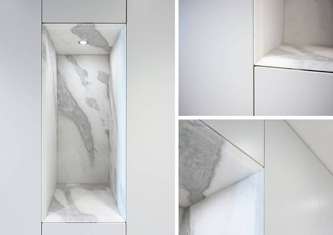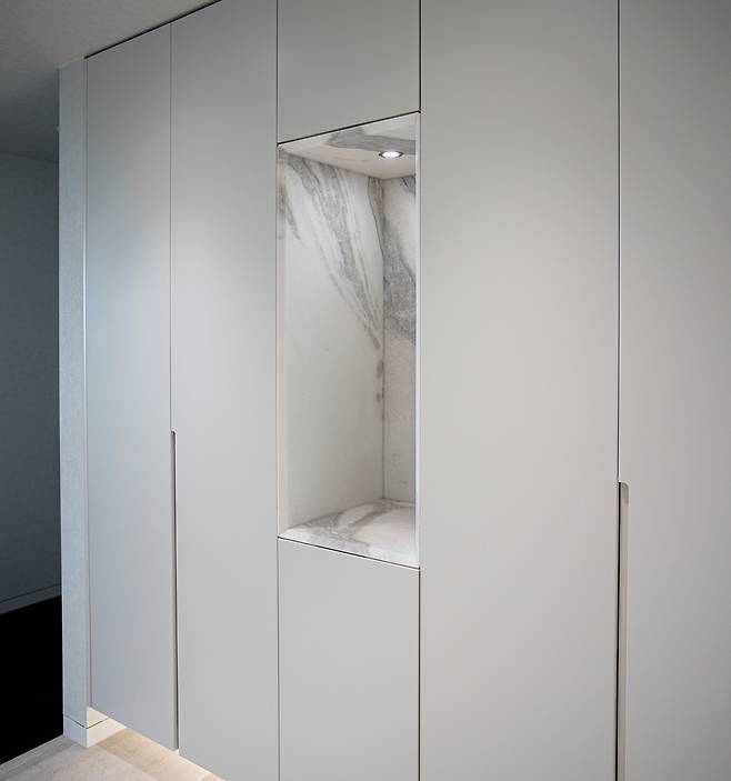 주방 아일랜드에 사용된 천연 대리석으로 포인트를 준 현관 공간이다. 미니멀한 디자인과 고급스러운 소재가 조화를 이루며, 깔끔한 마감과 간결한 선 처리로 모던하면서도 정돈된 느낌을 강조했다. 내부 조명은 대리석의 질감을 더욱 돋보이게 하고, 45° 컷팅으로 정교하게 마감된 디테일은 공간의 품격을 한층 높여준다. 우레탄 도장 도어는 손잡이가 노출되지 않도록 자체 손잡이로 제작되어 불 필요한 요 소 없이 깔 끔한 디자인을 완성한다. 이 현관은 단순한 출입구를 넘어, 마치 미술관의 전시 공간과 같은 고급스러운 분위기를 연출한다.