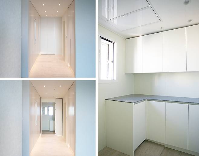 이 현장은 최근 아파트 평면과는 다른 독특한 구조가 특징이다. 현관 입구 반대편에 다용도실로 연결되는 별도의 통로가 있으며, 주방으로 바로 이어지는 지름길 같은 형태를 갖추고 있다. 이 공간에 간단한 짐을 수납할 수 있는 맞춤 가구를 제작했다. 또한, 현관에서 다용도실 입구가 보이지 않도록 신발장 도어와 같은 마감재를 적용해 마치 다용도실이 없는 것처럼 깔끔하게 감추었다. 문을 닫으면 신발장처럼 보이면서도 정돈된 분 위기를 유지하고, 필요할 때만 열어 효율적으로 사용할 수 있도록 설계했다. 신발장과 일체감 있는 디자인 덕분에 공간은 더욱 깔끔하고 고급스러운 분위기를 연출한다.