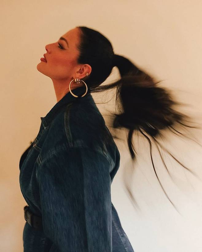 특히 스타일링의 중심은 헤어와 액세서리다. 높게 묶은 포니테일은 날렵한 인상을 주며 그녀의 얼굴선을 더욱 또렷하게 부각시켰고, 큼직한 후프 이어링은 시선을 사로잡는 포인트가 되었다. 군더더기 없이 깔끔한 메이크업과 함께한 이번 룩은 단순한 데님 스타일을 강렬한 섹시룩으로 탈바꿈시켰다.