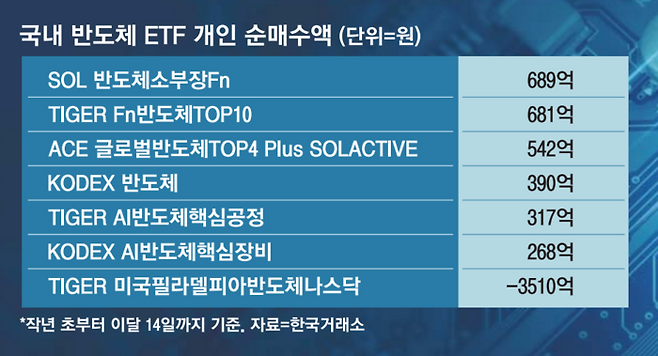 반면 해당 기간 개인투자자들은 소부장(소재·부품·장비), 1등 기업, 핵심 공정 등 테마형 반도체 ETF를 사들이는 모습을 보였다. 대표적으로 ‘SOL 반도체소부장Fn’ ETF를 689억원 순매수했다.