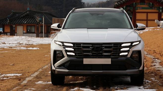 기본형부터 대담한 인상을 지닌 더 뉴 투싼이다. 페이스리프트와 함께 DRL 그래픽과 그릴 패턴이 두껍고 입체적이게 다듬어졌다. 이를 통해 차량은 더욱 단단하고 듬직해 보이는 것 같다. 범퍼 가니시의 면적도 넓어지면서 전면부의 입체감과 과감함은 더욱 강조된다. 평소에 점등되어 있는 DRL은 히든 가니시 타입 LED를 활용하여, 소등 시 전면 라디에이터 그릴과 자연스레 일체화된다. 실제 헤드 램프는 범퍼 양 끝단에 배치되어 있고, 프로젝션 타입 LED와 지능형 헤드램프 기술이 모두 투입된다. 두꺼운 프런트 에이프런이 SUV 다운 분위기를 강화한다.