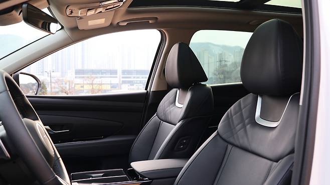 시승 차량은 투싼 하이브리드 1.6 HEV 인스퍼레이션 등급이다. 1.6L급 가솔린 싱글 터보 엔진과 고출력 모터를 병렬 배치하는 하이브리드 엔진이다. 지난 페이스리프트와 함께 고출력 모터는 47.7Kwh 급으로 출력이 향상된 바 있다. 인스퍼레이션 등급은 제공되는 옵션 트림중 가장 상위에 있다. 그 외에 추가 옵션도 대부분 적용된 상태다. 빌트인 캠 2+증강현실 내비게이션, 파킹 어시스트, 파노라마 선루프, BOSE 프리미엄 사운드, 19인치 알로이 휠, 퀼팅 천연가죽 시트 등 생각보다 상위 트림에도 추가해야 할 옵션이 많은 편이다.