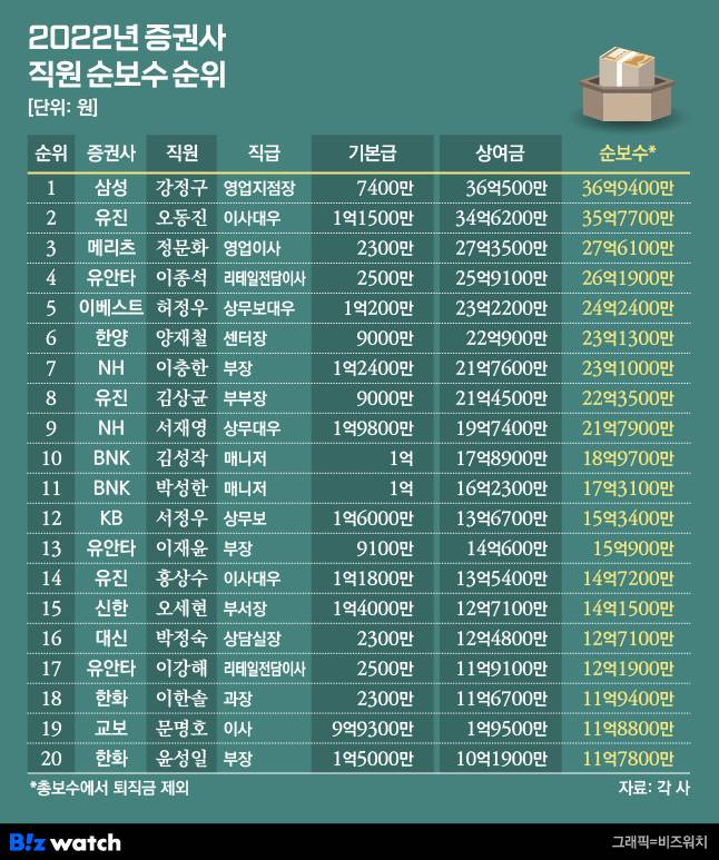 강정구 삼성증권 삼성금융센터 지점장은 지난해 연봉 36억9400만원을 받아 증권사 일반 직원 전체 가운데 1위를 차지했다. 강 지점장의 기본급은 7400만원에 불과했지만 상여금이 36억500만원에 달했다. 기타보수로 1500만원을 받았다. 이는 장석훈 삼성증권 대표이사 사장이 받은 순보수(19억300만원)의 2배에 달한다.