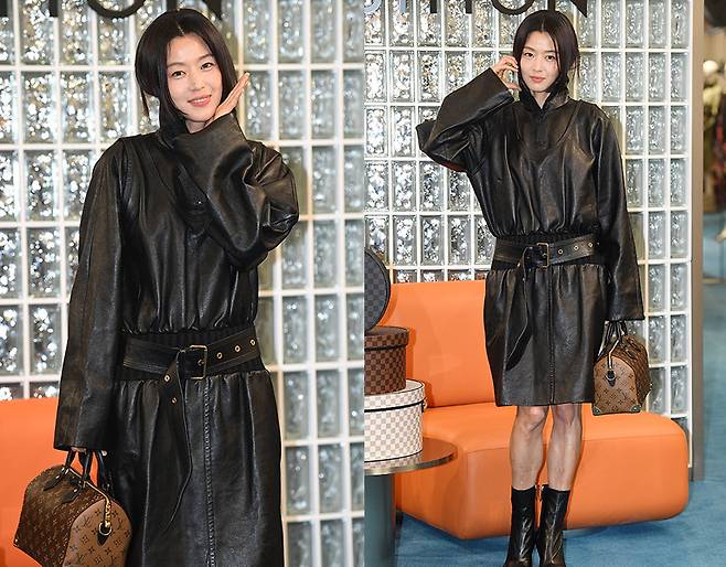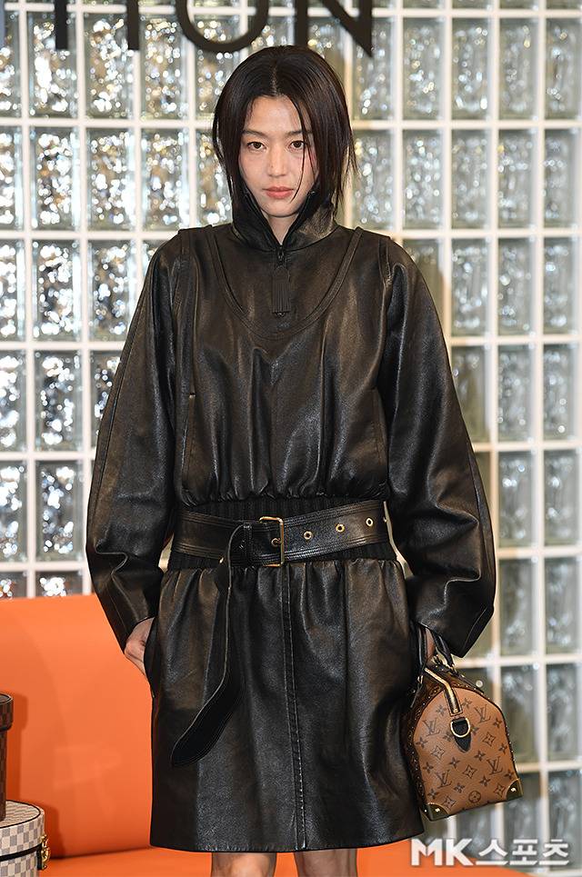 전지현은 블랙 가죽 코트 원피스에 와이드 벨트를 더해 시크하면서도 볼륨감 있는 실루엣을 연출했습니다.