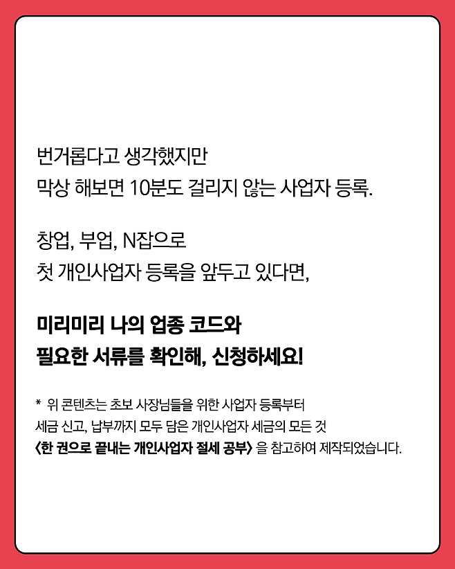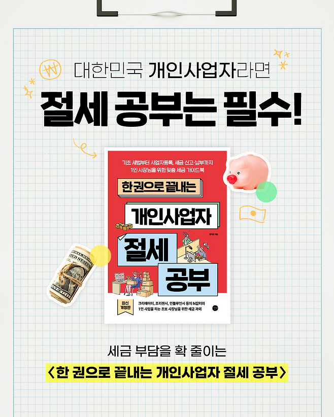 * 이 콘텐츠는 창업과 N잡러를 꿈꾸는 직장인, 초보 1인 사장님을 위한 맞춤 세금 가이드북 <한 권으로 끝내는 개인사업자 절세 공부> 을 참고하여 제작되었습니다.