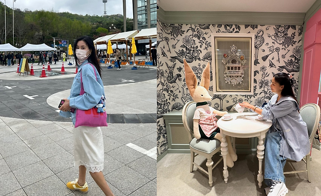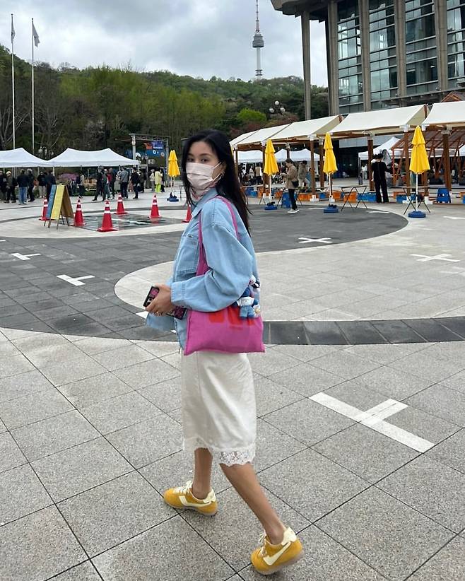 광장에서 선보인 룩은 라이트 블루 데님 재킷과 화이트 레이스 스커트의 조합이 인상적이다. 핑크 토트백과 옐로우 스니커즈로 컬러풀한 포인트를 더해 활동적이면서도 페미닌한 스타일을 연출하고 있다.