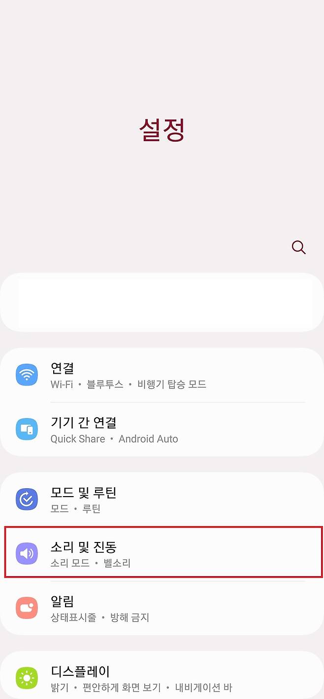 설정화면에서 ''소리 및 진동''을 선택합니다.