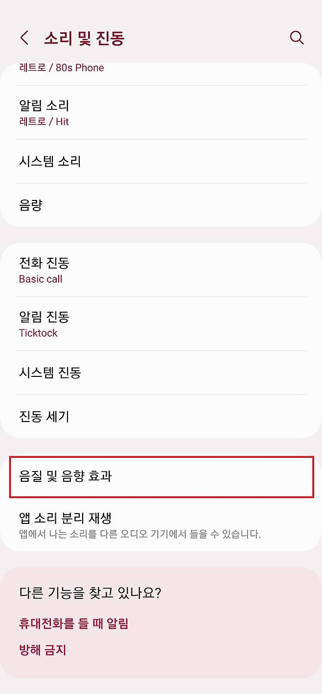 ''소리 및 진동'' 화면에서 아래로 내려서 ''음질 및 음향효과''를 선택합니다.