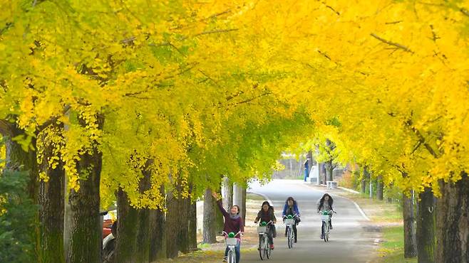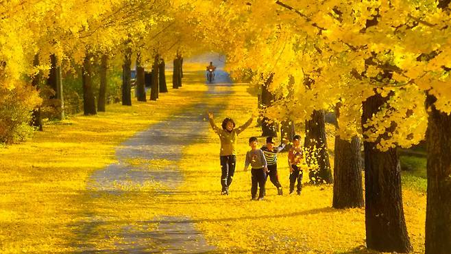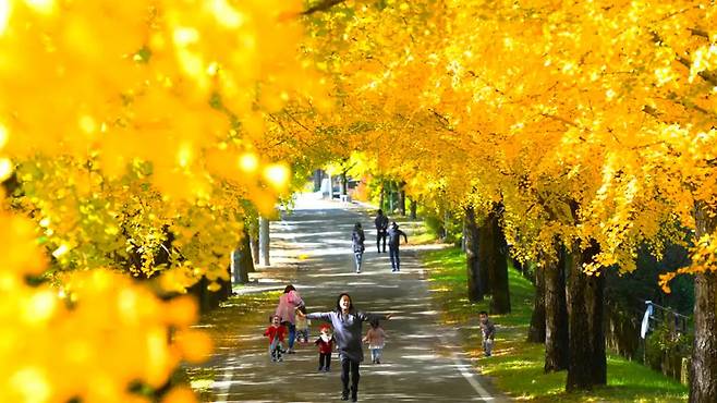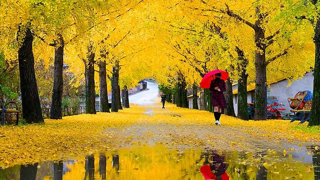 약 100m의 길 양옆으로 줄지어 선 은행나무들이 만든 황금빛 터널은 마치 동화 속 장면을 현실로 꺼내놓은 듯한 풍경을 선사합니다.