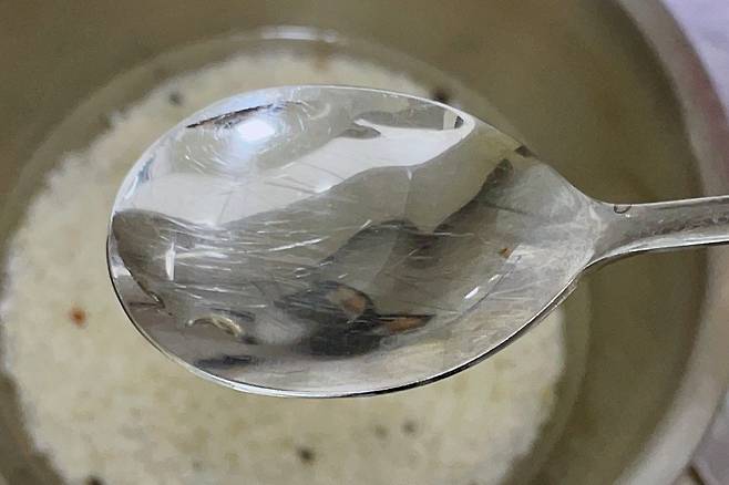 방법은 성인 숟가락 1/3 정도 오게 물에 섞어주시고요. 그 물에 쌀을 10분 정도 담가 두세요.