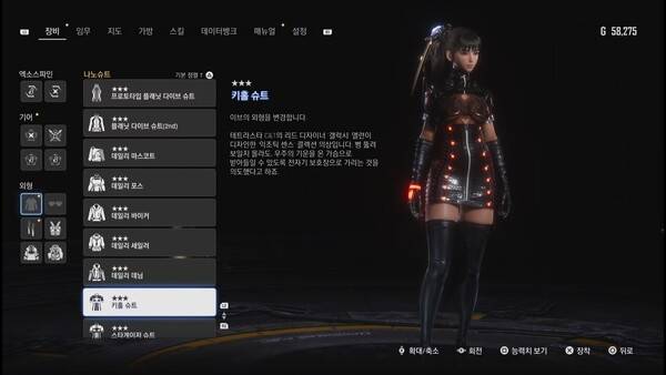 PS5 버전 출시 이후 정식 업데이트와 '니어 오토마타' DLC 추가로 다양한 나노슈트가 등장했다. 여기에 '승리의 여신: 니케' DLC까지 더해져, 니케 인기 캐릭터들의 의상을 이브가 직접 착용할 수 있게 됐다.