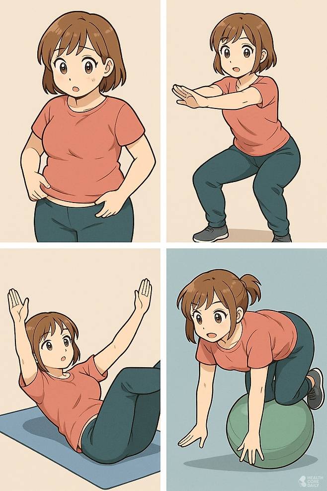 - 허리·목 힘 사용 금지, 척추 곧게 유지, 짐볼 크기 조절