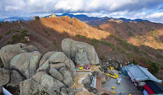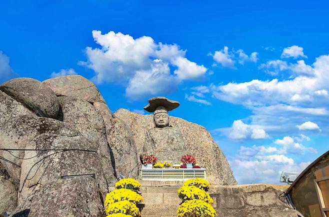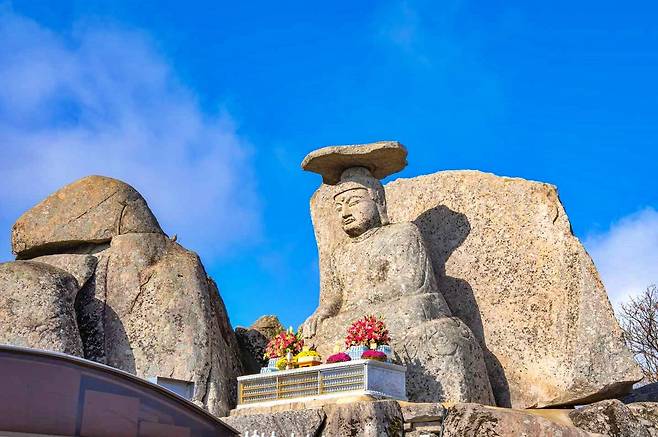 정상에 다다르면 바위에 조각된 좌불상이 눈앞에 나타나며, 그 신비로운 모습에 많은 이들이 감탄을 자아낸다. 관봉석조여래좌상은 국내 석조불상 중에서도 드물게 암봉을 그대로 활용해 조각한 예로, 갓 모양의 상단부는 고려 시대에 연꽃무늬로 조각돼 얹힌 것으로 알려져 있다. 이 불상에 기도하면 한 가지 소원은 꼭 이루어진다는 이야기가 전해지면서 해마다 수많은 이들이 발걸음을 한다.
