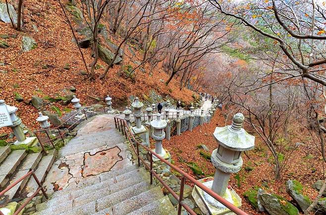 - 팔공산 갓바위 앞길 등산 코스: 갓바위탐방지원센터→관암사→돌계단→관봉(갓바위) 정상
