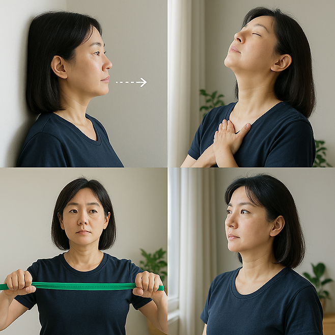 • ① 턱 당기기(Chin tucks) 10회 : 벽에 뒤통수 붙이고 가볍게 뒤로 밀착→5초.